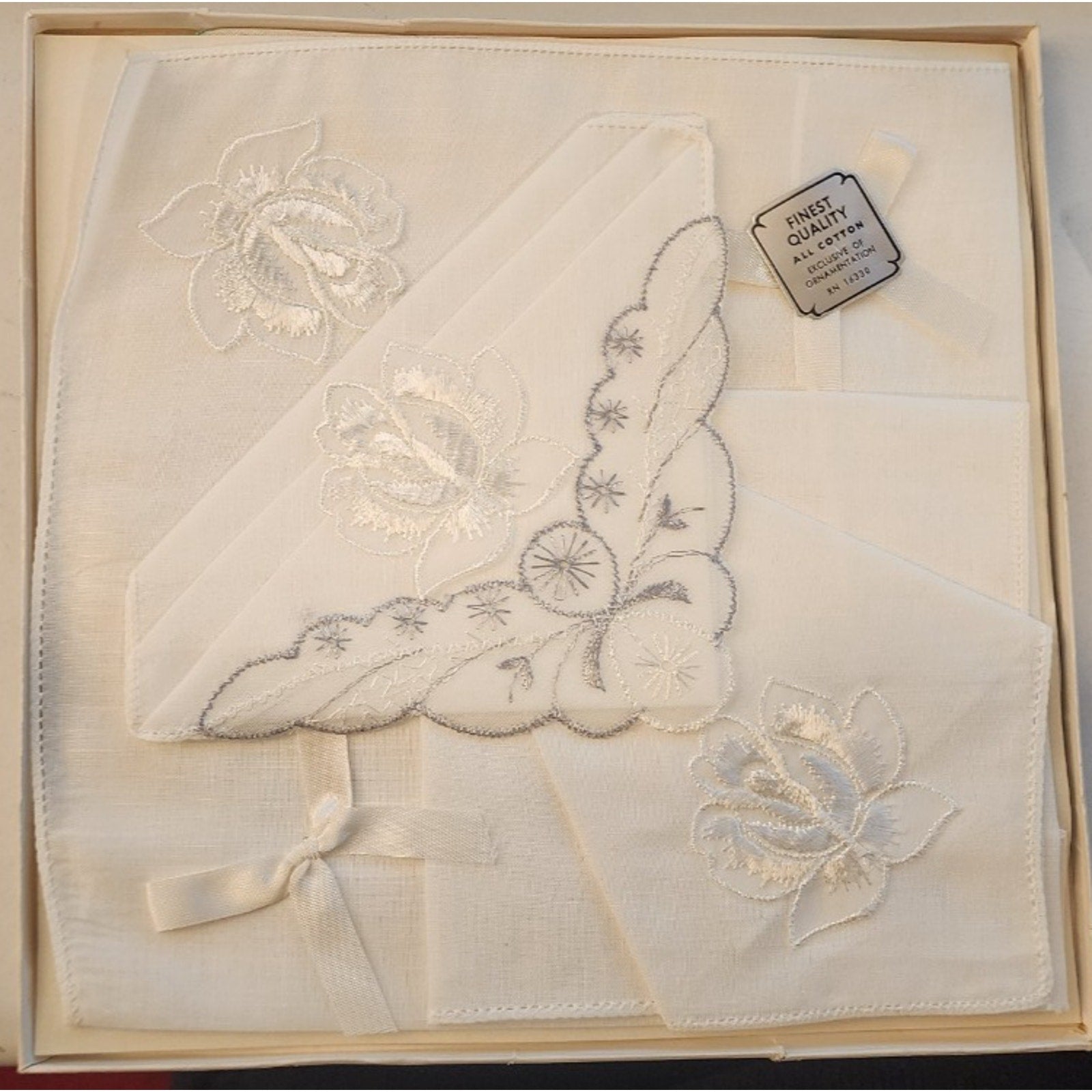 The box that these came in is damaged and warped. The Handkerchiefs are not damaged. One of the handkerchiefs is folded on one corner. See photos. Pretty pieces.