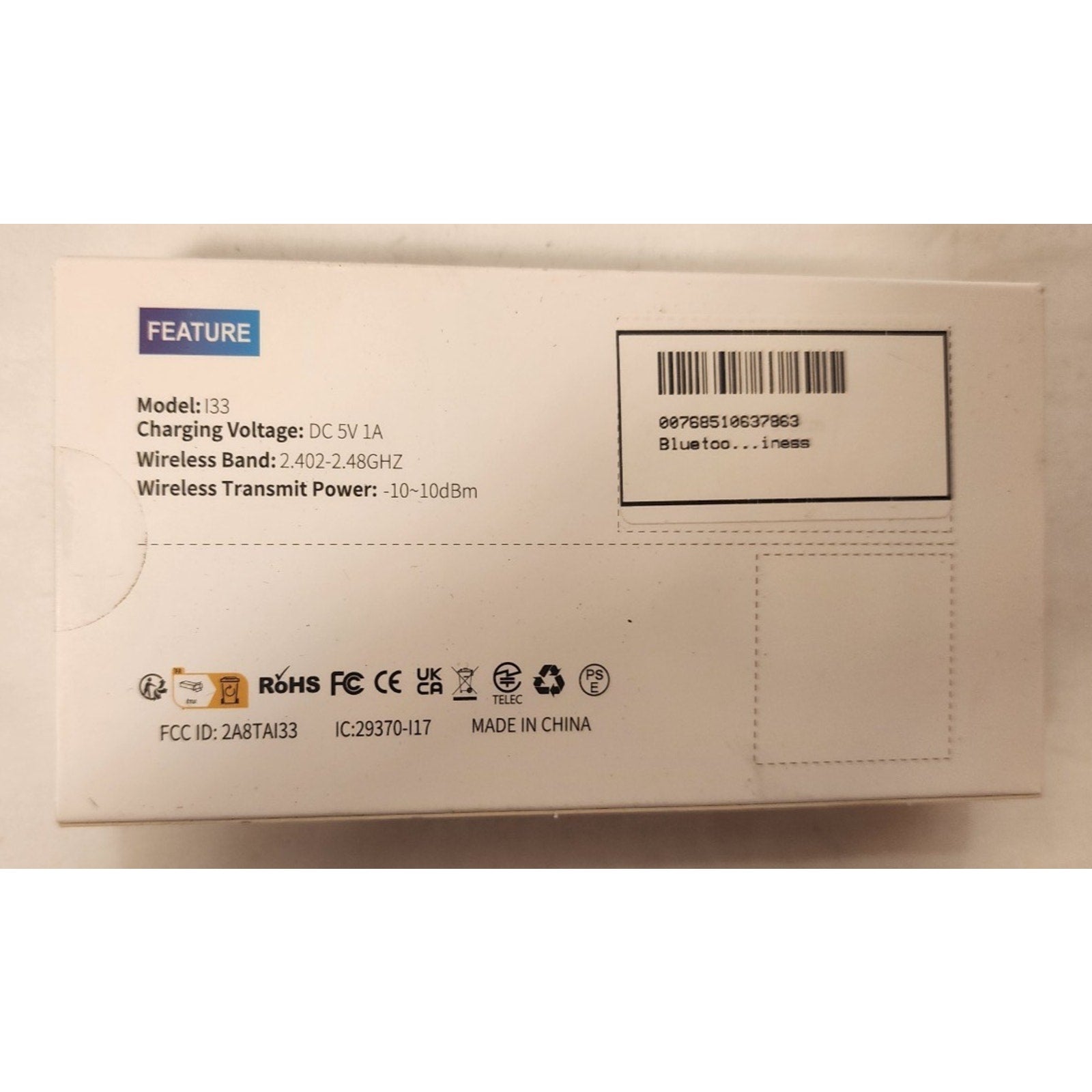 Bluetooth Headset - I33 - Band 2.402-2.48GHZ - Power -10~10dBm - Touch Control